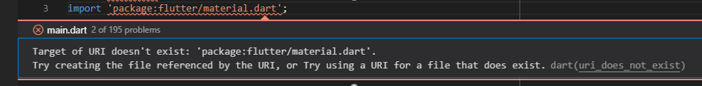 Target of URL doesn't exist : 'package:flutter/material.dart'. 오류가 났습니다. 재택근무로 인해 집에서 작업하던 파일을 회사에서 여는 도중에 발생한 문제! flutter는 처음이라 이것저것 찾아보면서 하는 도중입니다. 기존 파일들에서는 나지 않는 에러가 나서 당황했습니다.