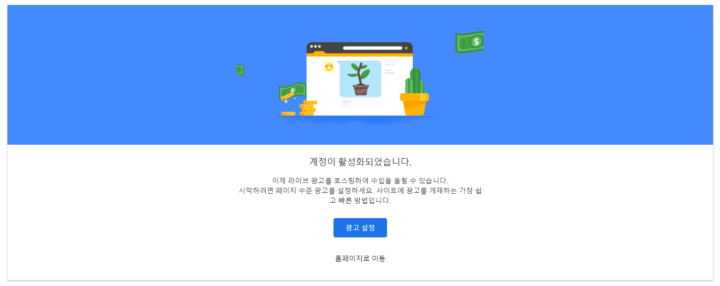 계정이 활성화가 되어있다는 페이지가 뜨고 이제 광고 설정을 클릭해봐요! 작은 팝업도 이렇게 친절하게 잘 보여주니까 순서대로 진행하시면 될 것 같아요!