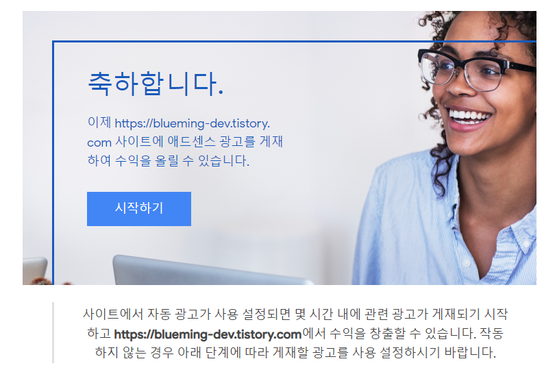 이렇게 안내 메일이 발송 되어서 왔구요. 블로그 주소는 지금 현재 이 블로그 주소니까 따로 블러 처리는 하지 않고 올릴게요. 시작하기를 누르면페이지가 이동됩니다.