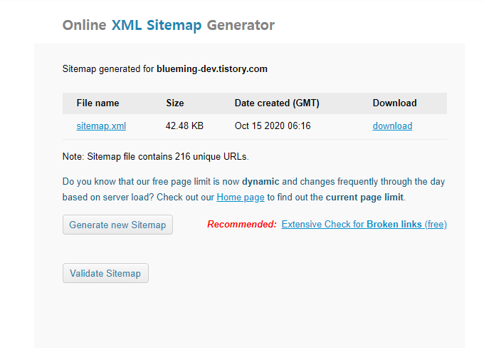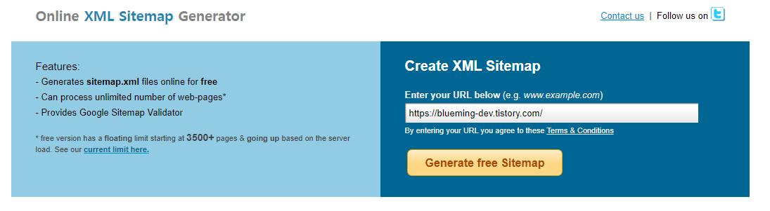 주소를 들어가시면 페이지에 www. 이라고 된 부분에 본인의 티스토리 주소를 복사해서 붙여넣어주세요. 붙여 넣어주신 후 Generate free Sitemap 버튼을 클릭해주시면 그 후 상세페이지로 이동합니다.
