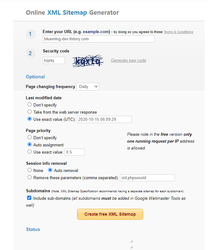 아까 입력한 블로그 주소가 나와있네요. 블로그 주소 밑에 있는 보안 키도 맞춰서 입력해주세요. 보이시는대로 설정을 다 하셨다면 맨 밑에 있는 Create free XML Sitemap 버튼을 클릭해주세요.