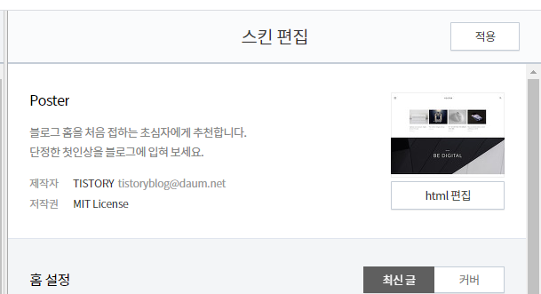 블로그의 스킨 변경 페이지에서 HTML 편집 버튼을 클릭해주세요! HTML 버튼을 클릭하면 해당 블로그 스킨에 해당되는 HTML 코드들을 확인 할 수 있습니다. <head> </head> 태그 안에 넣어주세요! 여기까지만 하면 이제 html을 건드려야 하는 일은 없습니다!