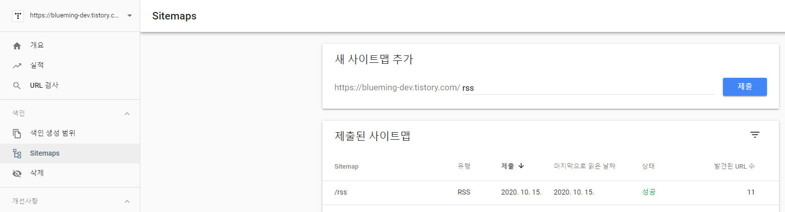 콘솔의 속성 설정 페이지에서 Sitemaps 를 클릭해서 새 사이트맵 추가 > 본인의 블로그 주소 뒤에 rss를 입력해주신 후 제출 버튼을 클릭하면 이런 팝업 안내 창이 나옵니다.