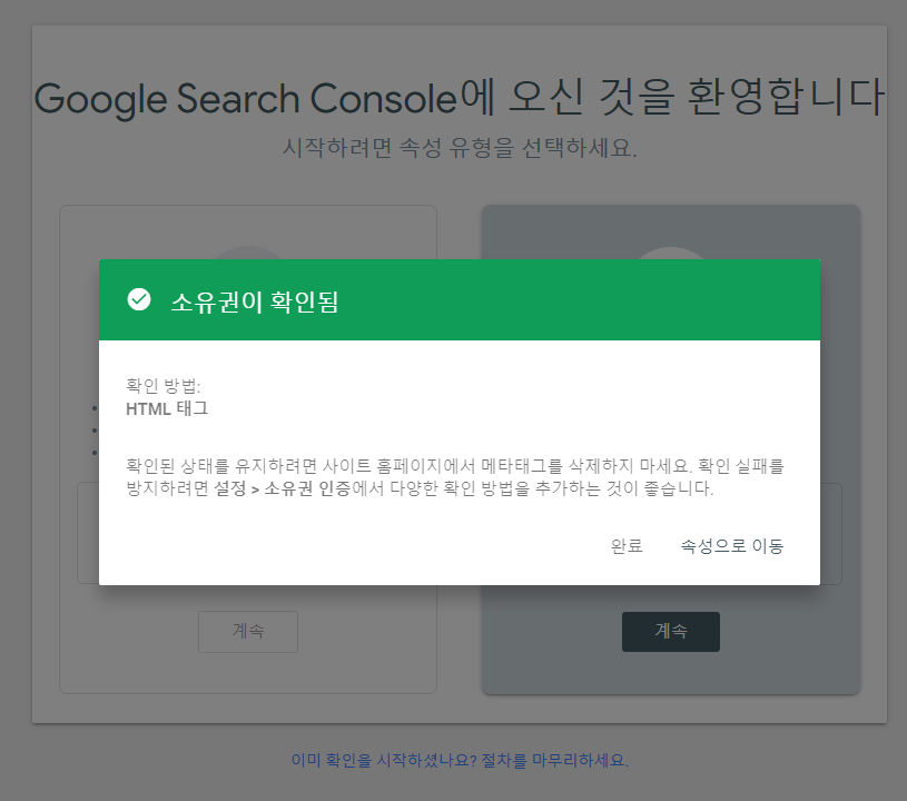 붙여넣고, 적용을 클릭하신 후 다시 소유권 확인 페이지로 돌아와주세요! 잠시 요청에 대하여 시간이 소요됩니다. 정상적인 요청이 확인 되면, 소유권 확인이 되었다는 팝업이 나옵니다. 후에 완료 버튼을 클릭하면 팝업이 닫히게 됩니다.