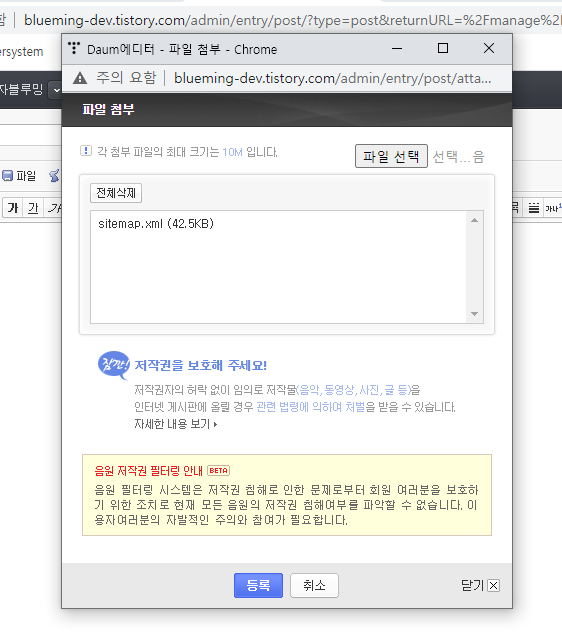 평소 글을 작성할 때 볼 수 있는 에디터 창과 다른 페이지가 나옵니다. 저기에서 파일을 클릭해서 아까 다운로드 받은 사이트맵 파일을 올려주세요!