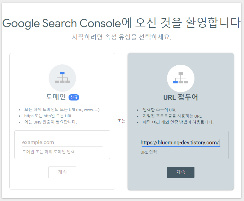 우측에 있는 URL 접두어에 본인의 티스토리 블로그 주소를 입력해주세요! 입력해주신 후 계속 버튼을 클릭해주세욥!