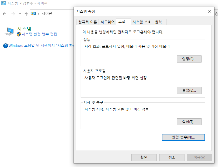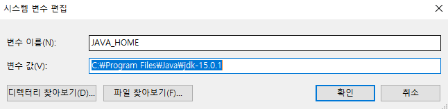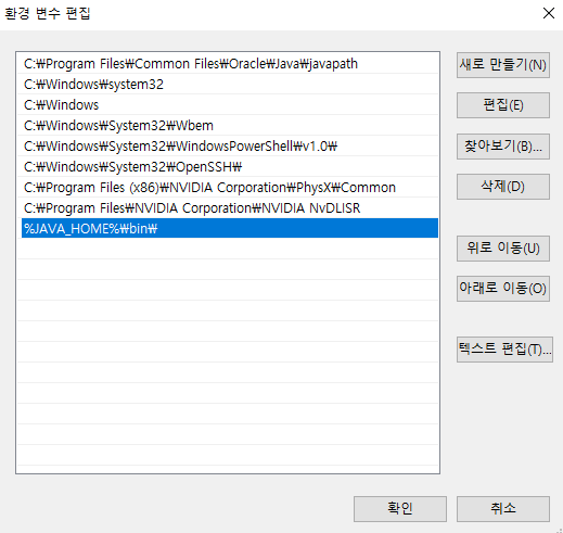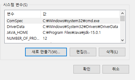 시스템 변수의 Path를 클릭하시고 편집을 누른 후 - 새로만들기 클릭 후 %JAVA_HOME%\bin\ 입력 후 확인을 클릭해주시면 됩니다.