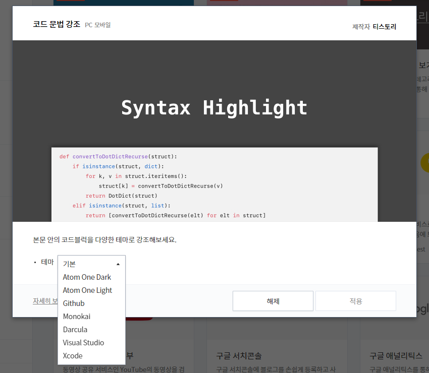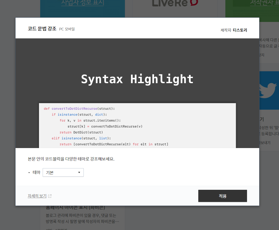 적용을 클릭하시면 플러그인이 티스토리 블로그 안에서 적용처리 됩니다. 테마 속성도 골라서 사용이 가능하니 필요하신 분들은 원하시는 테마를 선택 적용하시면 될 것 같습니다.