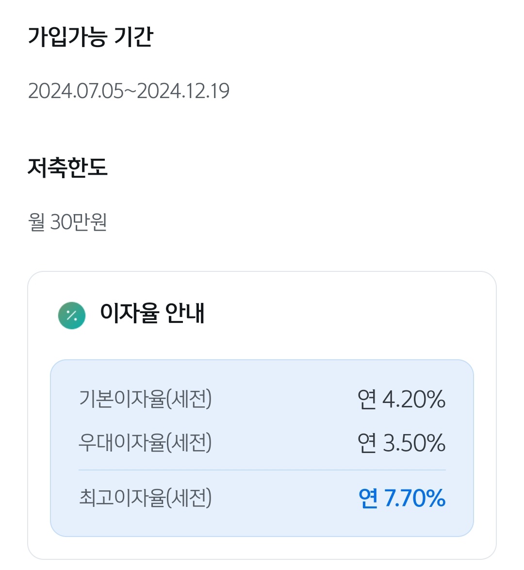 오는 12월 19일까지 20만좌 한도로 판매되는 ‘언제든 적금’은 매월 최대 30만원까지 입금할 수 있는 1년 만기 자유적금이다. 개인이나 개인사업자 고객이라면 누구나 가입 할 수 있다. 기본 이자율 연 4.2%에 우대이자율 최고 3.5%포인트를 더해 최고 연 7.7%의 이자율이 적용된다.