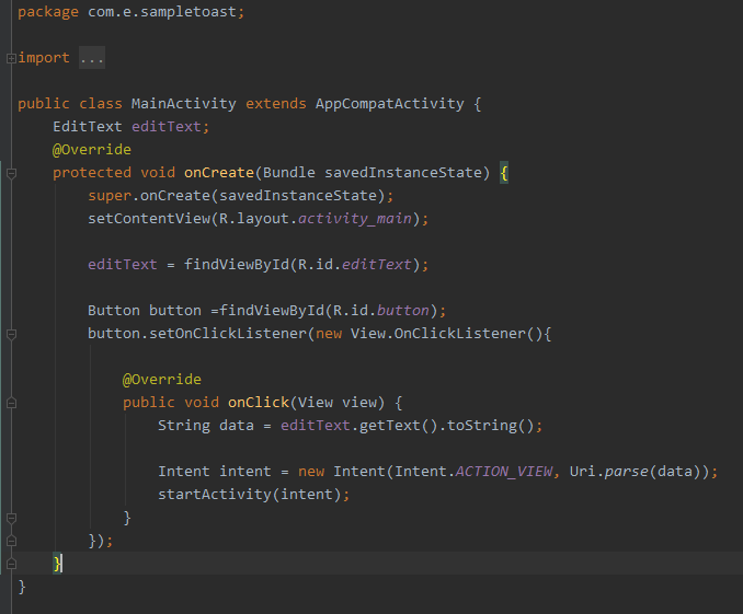 인텐트는 다른 액티비티를 띄우거나 기능을 동작시키기 위한 수단으로 사용하고 있습니다. 인탠트는 만든 앱 구성 요소 간에 작업 수행을 위한 정보를 전달하는 역할을 합니다.