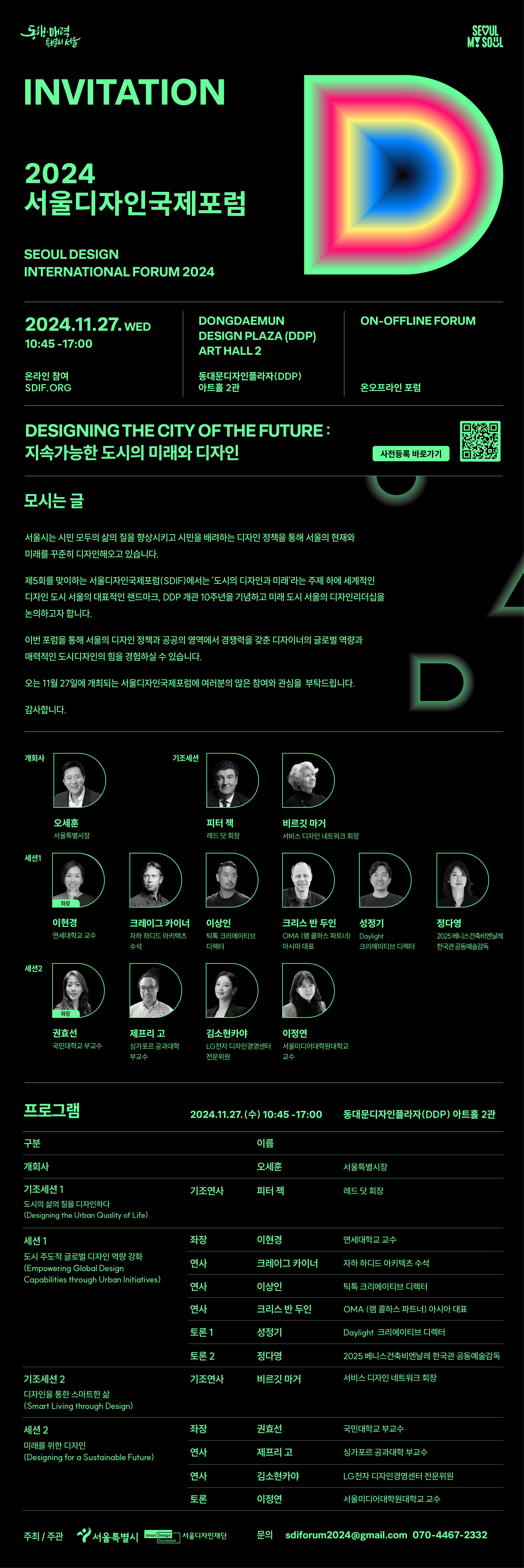 오는 11월 27일에 DDP(동대문디자인플라자) 아트홀2관에서 개최되는 서울디자인국제포럼 사전등록은 https://bit.ly/3ChfFqA 을 통해 등록하실 수 있습니다.