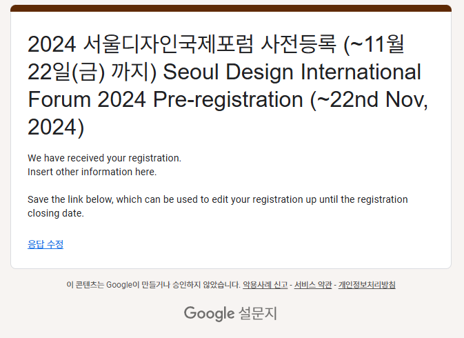 Step 3) 2024 서울디자인국제포럼 공식 홈페이지 이벤트 배너 또는 이벤트 QR송출 '구글폼'에 사전등록 시 개인정보 및 참가 인증샷 첨부