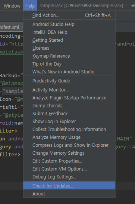 안드로이드 스튜디오가 최신 버전이 아닐 경우에는 스튜디오 툴 안에서 체크할 수 있습니다.